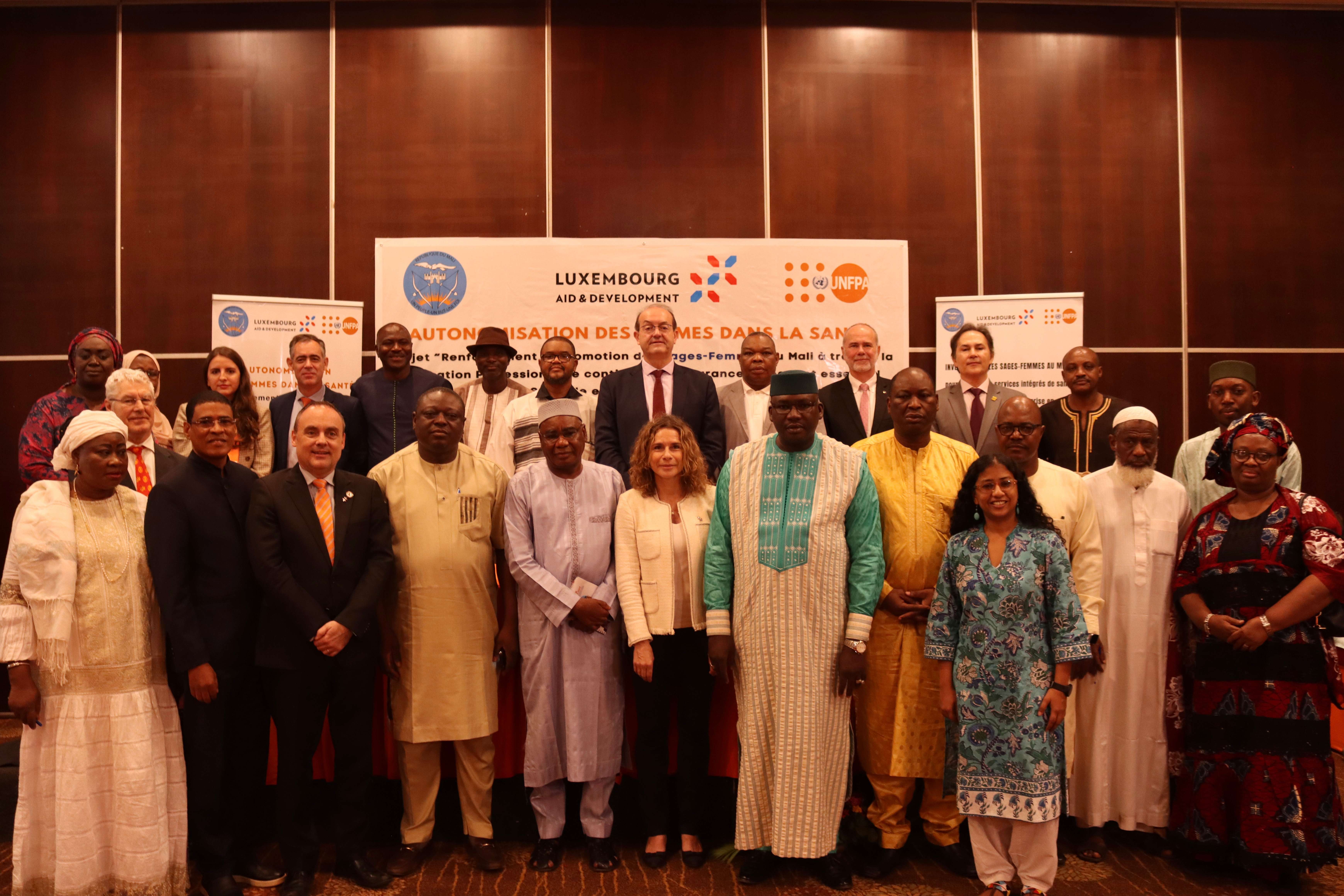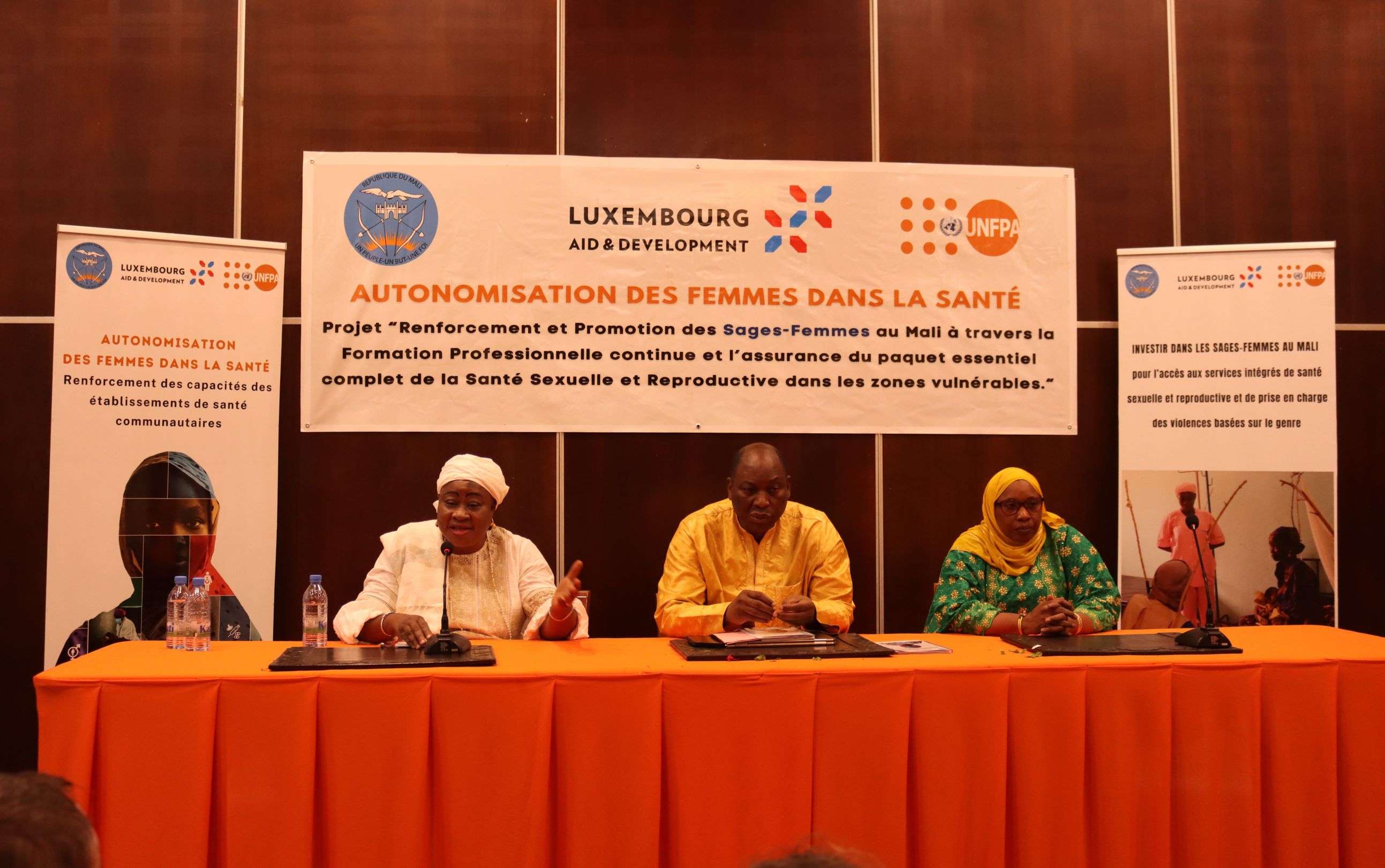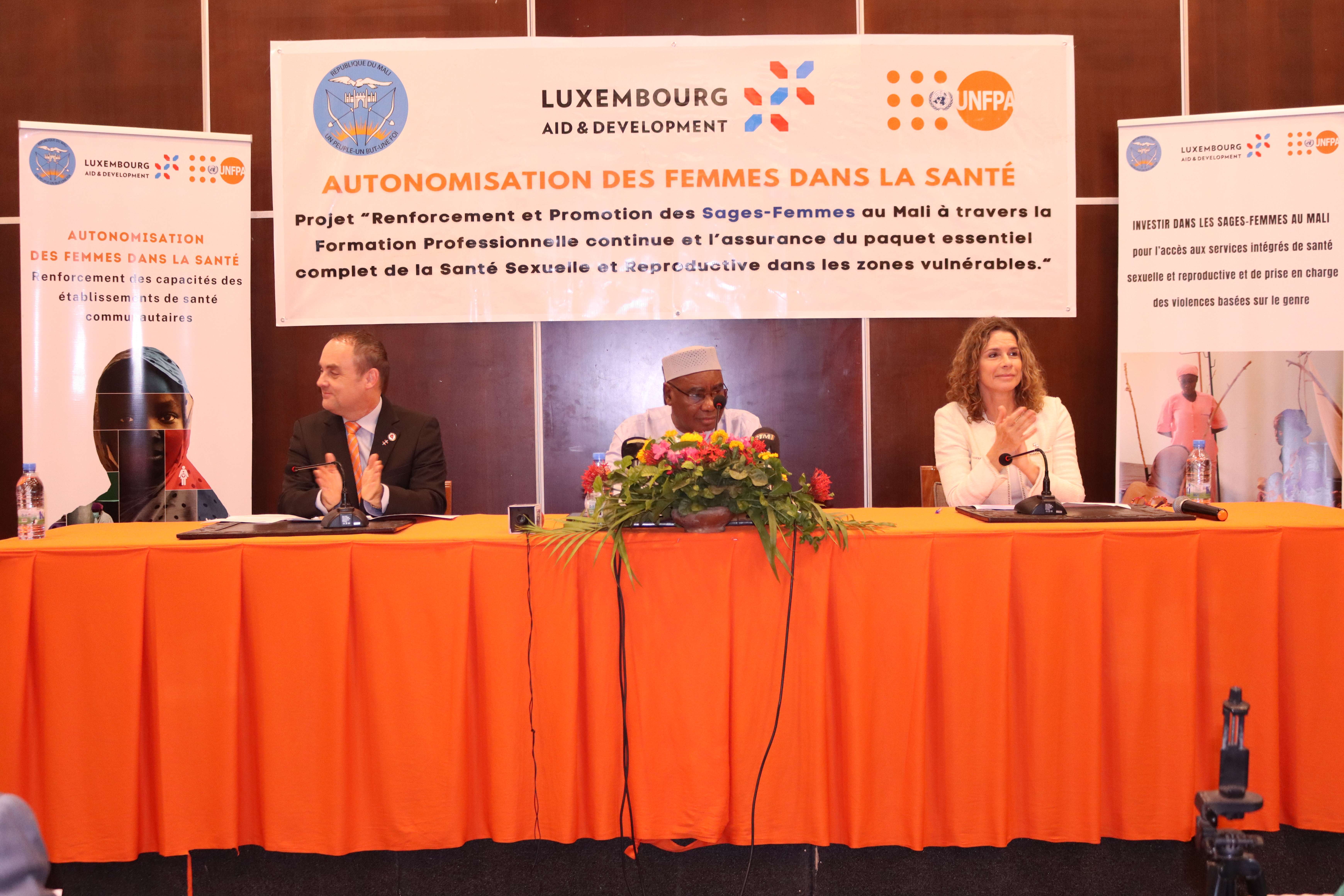 Le 6 décembre 2023 a eu lieu le lancement du projet « Autonomisation des Femmes dans la Santé : Renforcement et Promotion des Sages-Femmes au Mali à travers la Formation Professionnelle continue et l’assurance du paquet essentiel complet de la Santé Sexuelle et Reproductive dans les zones vulnérables » en présence de l’Ambassade du Luxembourg au Mali, des équipes du Fonds des Nations Unies pour la Population (UNFPA), du Secrétaire Général du Ministère de la Santé et de la Protection sociale, d’officiels des Ministères techniques concernés par le projet, du corps diplomatique et de plusieurs partenaires et parties prenantes.