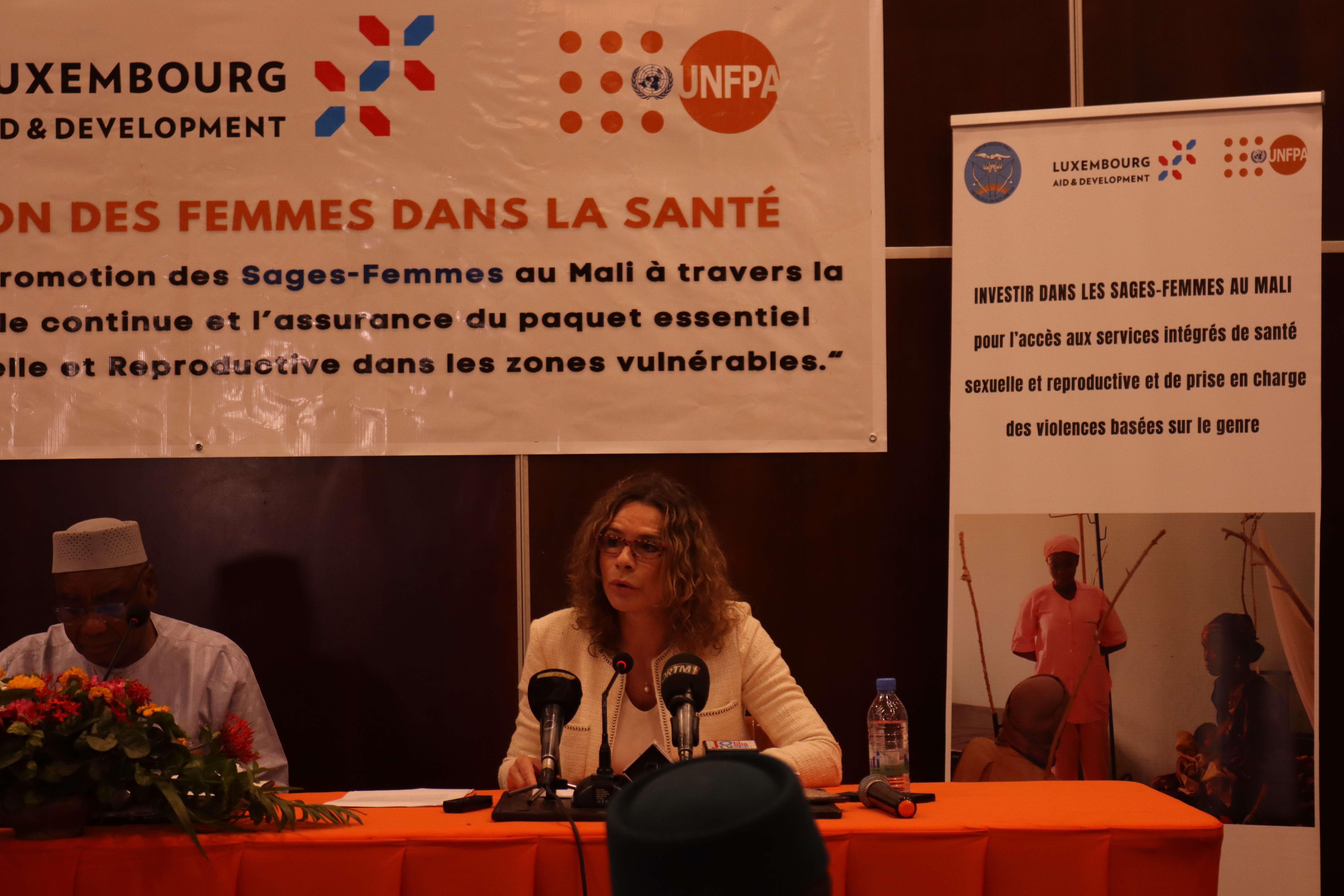 Dans son discours, la Chargée d’affaires a.i. à l’Ambassade du Luxembourg au Mali, Madame Marie-Anne Marx, a souligné que les professionnels de santé sont parmi les premiers acteurs qui peuvent contribuer à la prévention des violences basées sur le genre. Un professionnel de santé bien formé, bien équipé et qui travaille dans les conditions adéquates est au contact de patients qui parfois peuvent rencontrer des situations de violence et correspond à un intermédiaire clé. Les sages-femmes sont en mesure de répondre à 90% des besoins en matière d’interventions essentielles de santé sexuelle, reproductive, maternelle, néonatale et des adolescentes et adolescents.